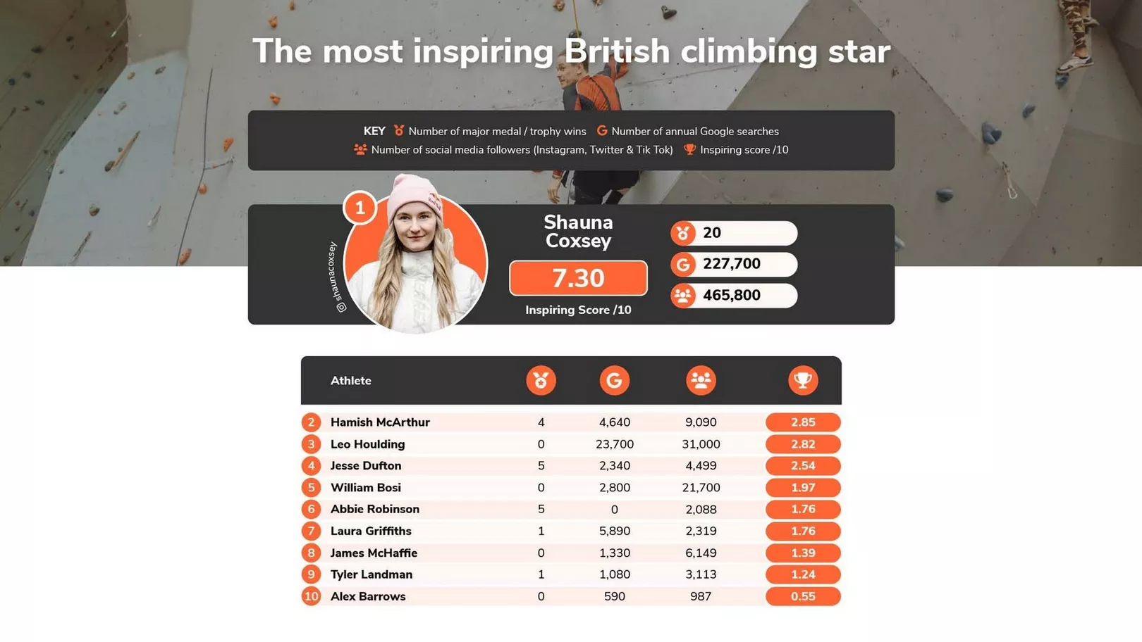 Coxsey has 20 major wins. Following the Toyko Olympics, she has 227,700 annual Google searches and 465,800 social media followers.
