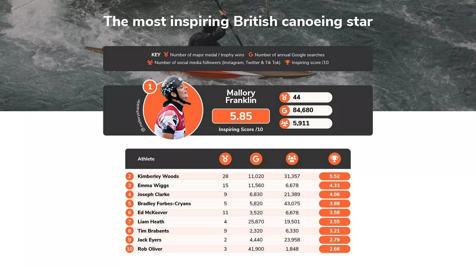 Mallory Franklin ranks as Britain’s most inspirational canoeing athlete according to all of the factors we looked at.