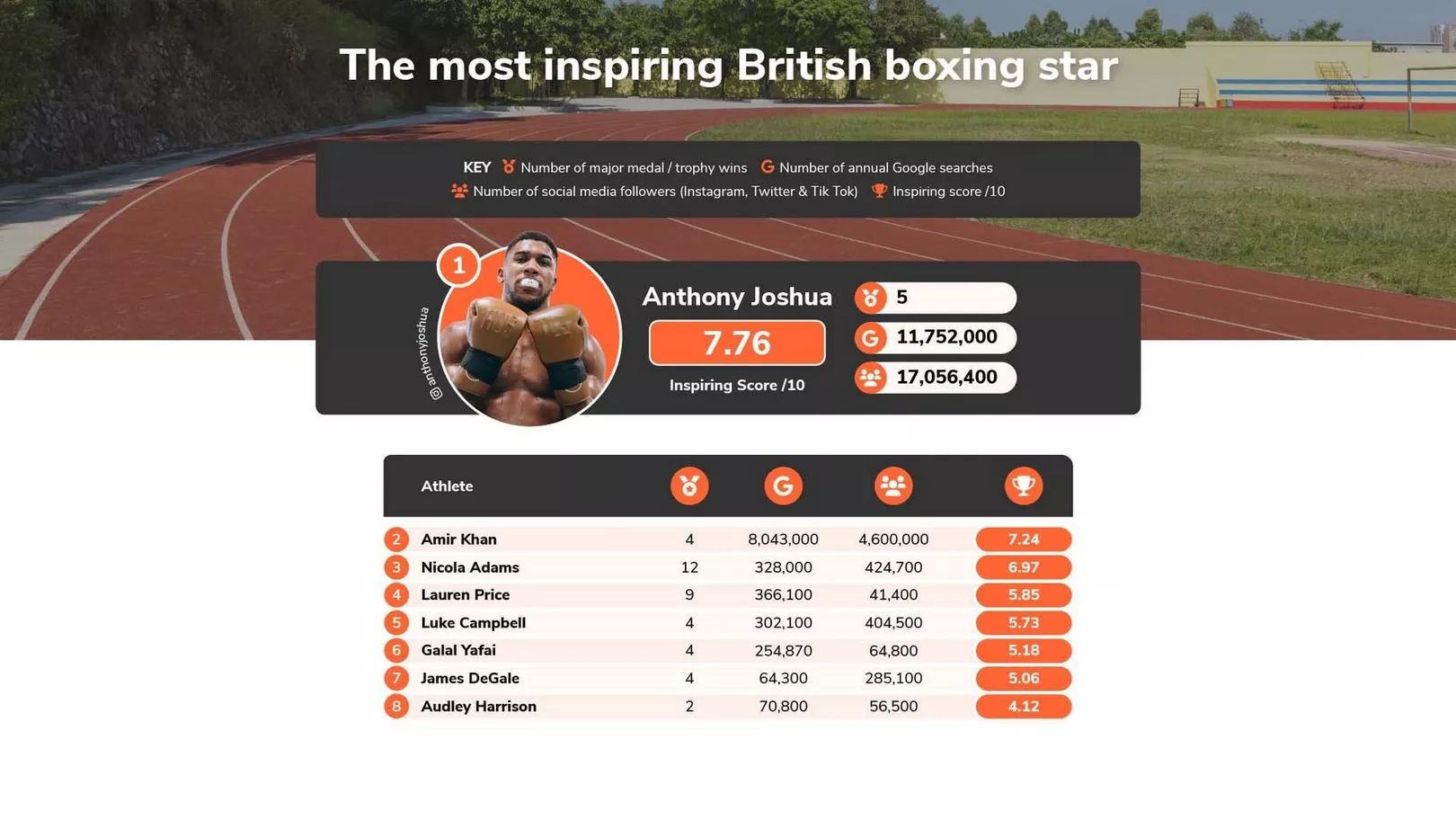 Anthony Joshua is Britain’s most inspirational boxer and ranks in 17th place on our list of British athletes.