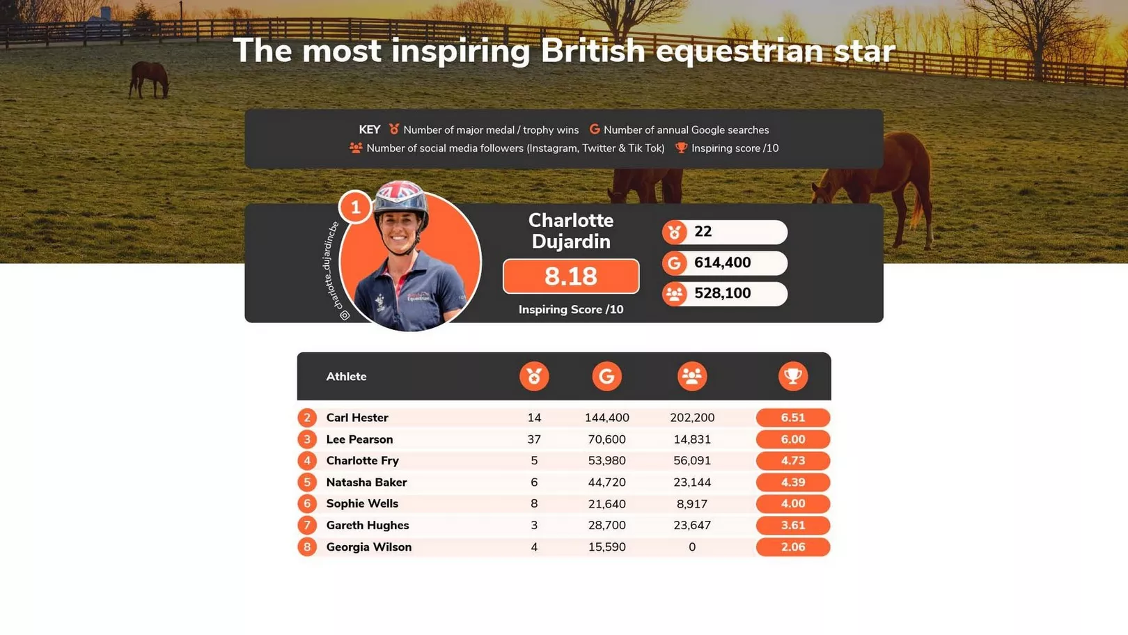 Dujardin has 22 major medals, including three Olympic gold medals, and she has 528,100 followers across all the social media platforms we looked at.