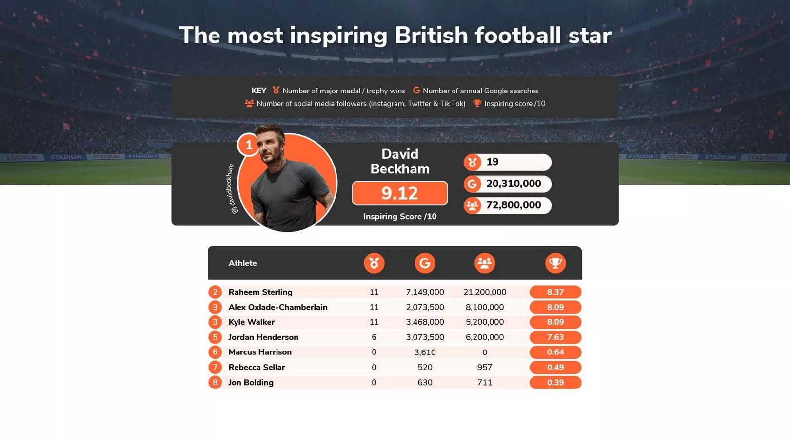 Beckham has 19 major cup wins and received 20,310,000 Google searches in the last 12 months. Beckham has 72,800,000 social media followers - that’s more than any other athlete we looked at.