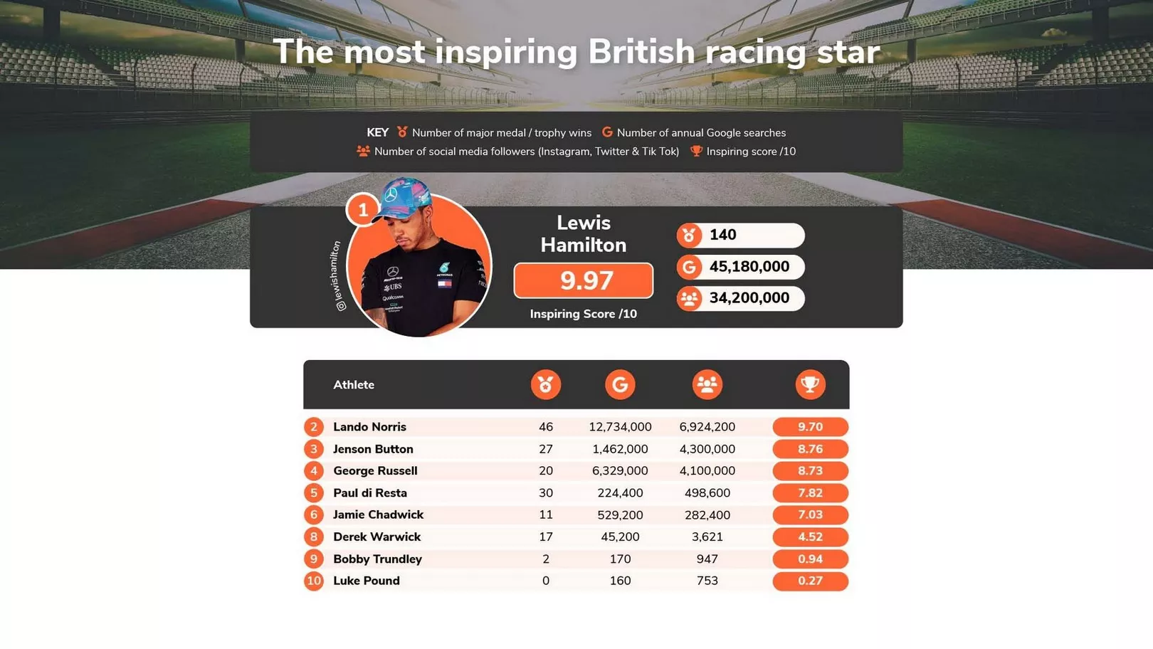 Despite these challenges, Hamilton has 140 major wins and received 45,180,000 Google searches in the last year. Across Instagram, TikTok and Twitter, Hamilton has 34,200,000 followers.
