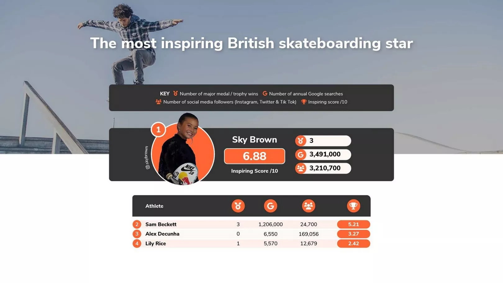 Sky Brown is the most inspiring British skateboarder we looked at, according to medal wins, Google searches and social media followers.
