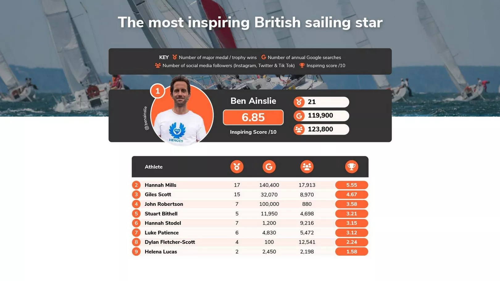 The British sailor has 21 major medal wins and 119,900 Google searches in the last 12 months. Ainslie also has 123,800 followers on the social media platforms we looked at.