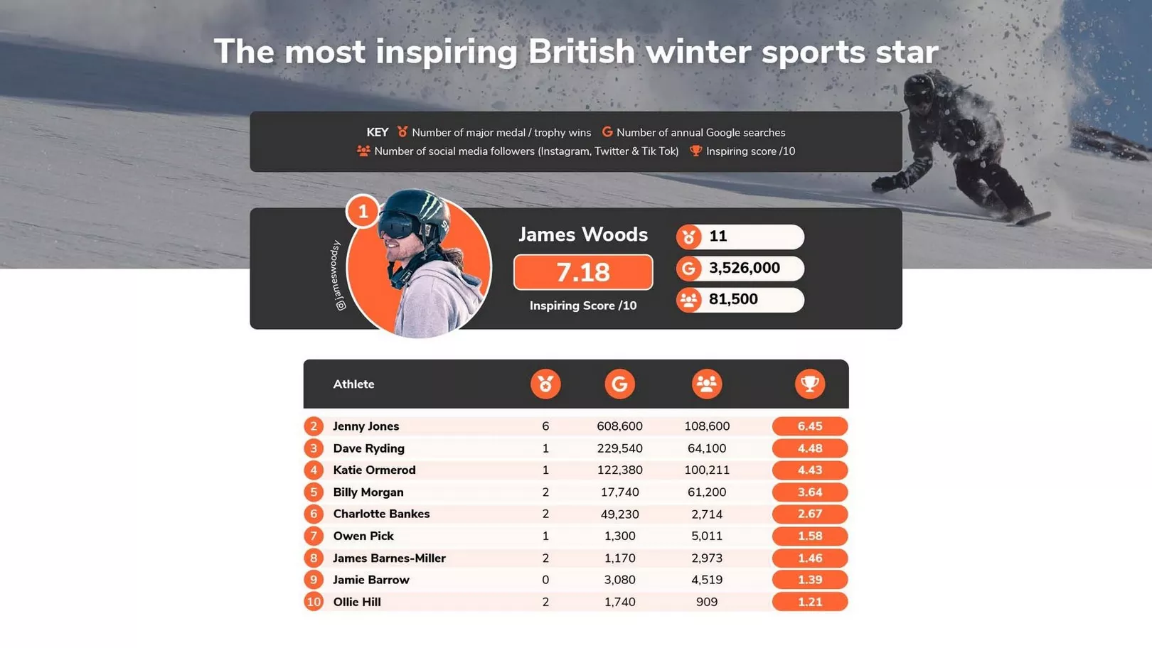 The Sheffield skier holds 11 major titles and has 81,500 followers on all of the social media sites we looked at.