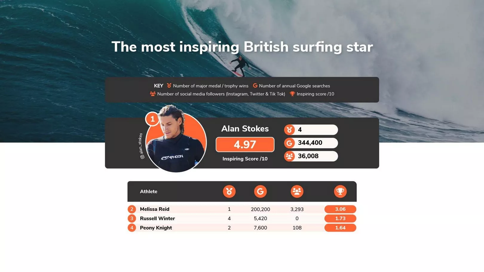 Surfer and model Alan Stokes is the most inspirational surfer on our list. Stokes had his first surfing lesson at age 6 after his family moved from Aldershot to Newquay.
