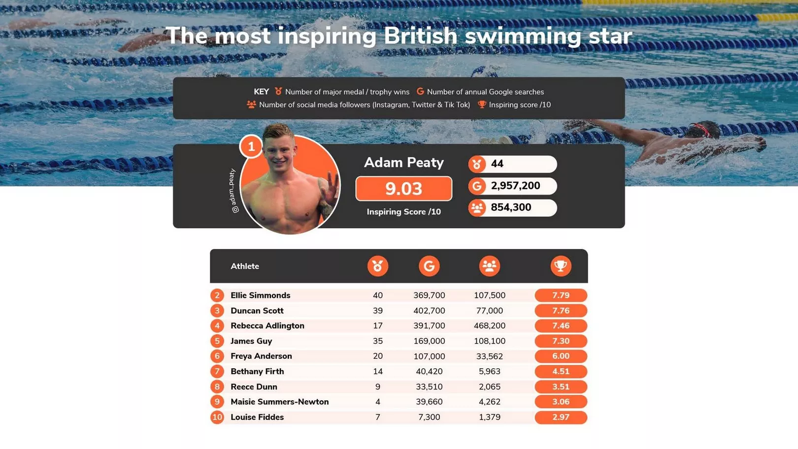 Adam Peaty is the most inspiring British swimmer on our list. With 44 major medal wins and 2,957,200 annual Google searches, Peaty’s success and popularity are undeniable.
