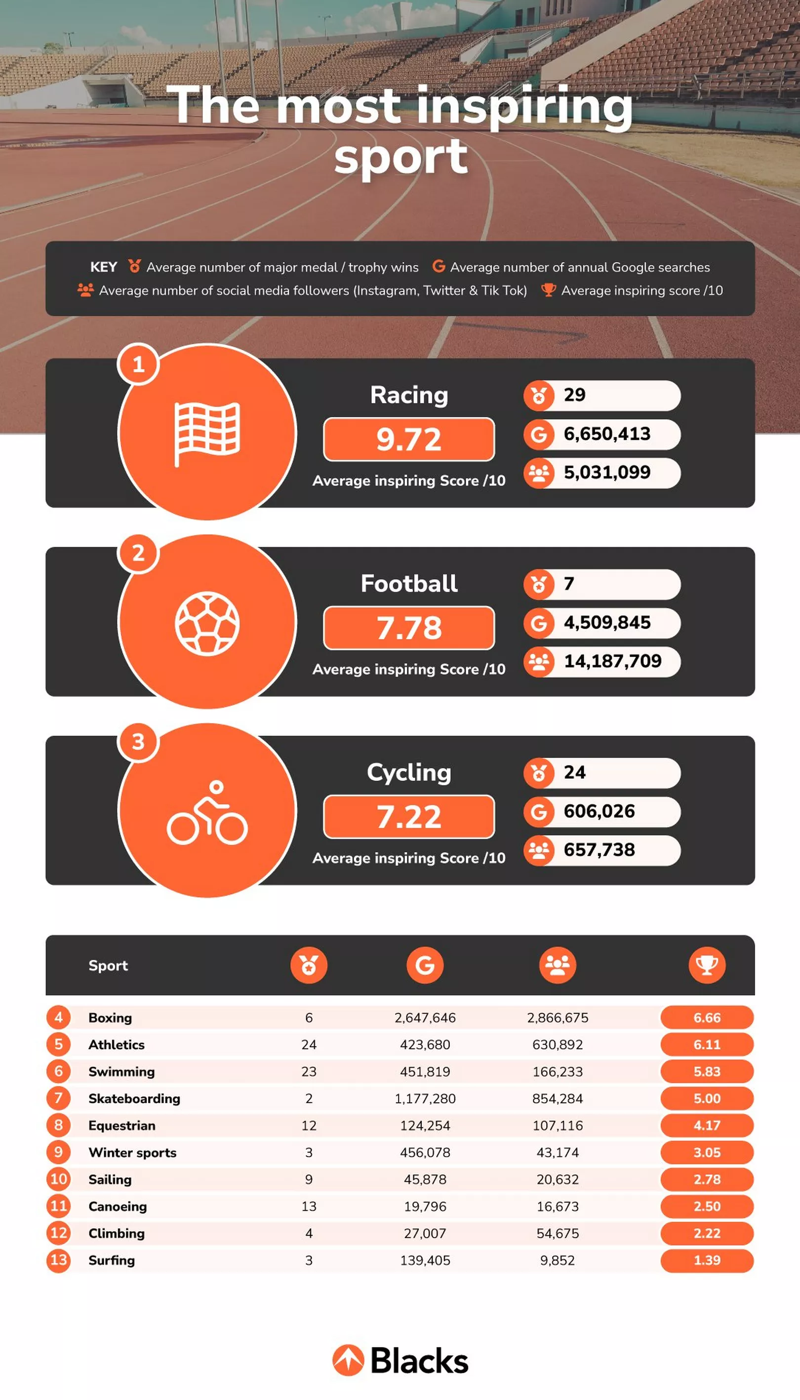 We calculated the average ‘inspiring score’ for all of the athletes we looked at in each sport. The sport with the highest average score is racing, where the athletes on our list average at 9.72 out of 10.