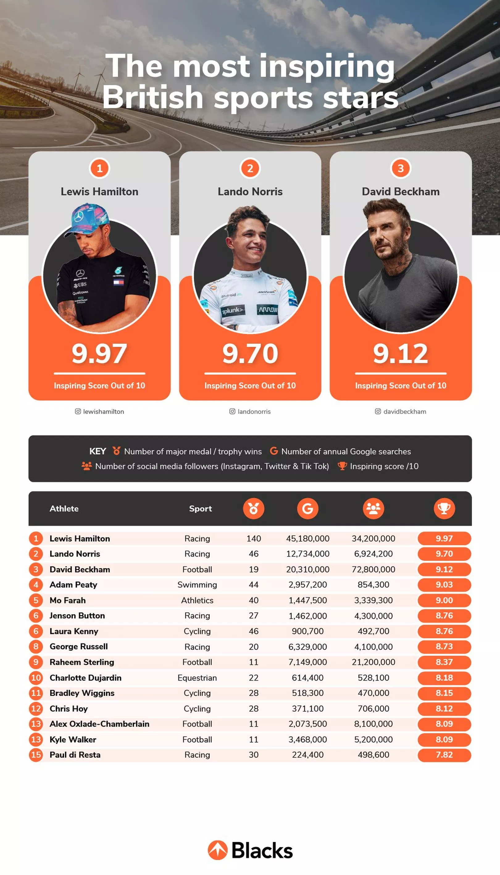 Lewis Hamilton is Britain’s most inspiring athlete according to our ranking. An inspiration to millions, Hamilton has found success despite the racism and economic barriers that he has faced in his career.