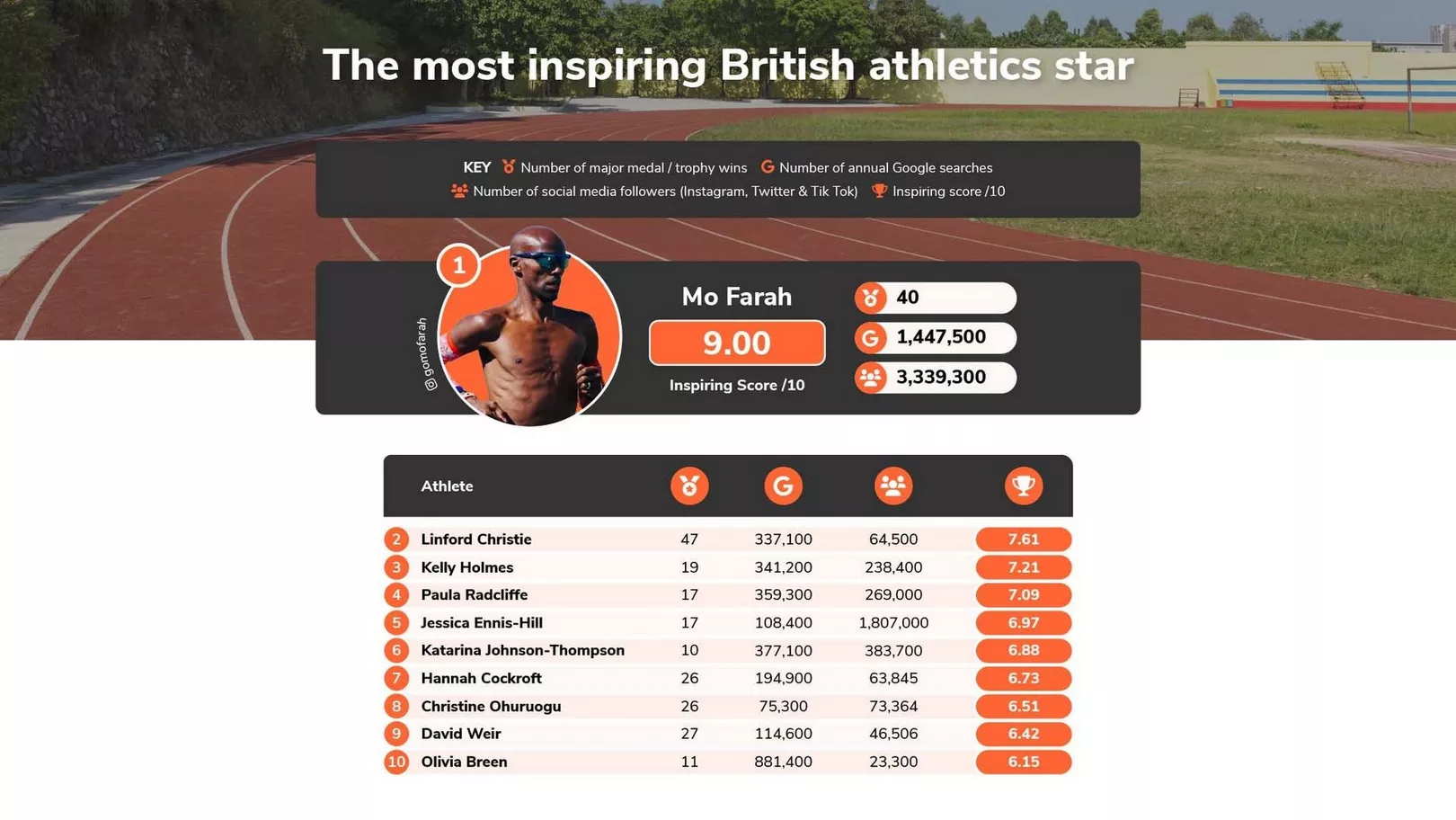 With 40 major medal wins and 1,447,500 Google searches in the last 12 months, Mo Farah ranks fifth overall on our list of British sports stars.
